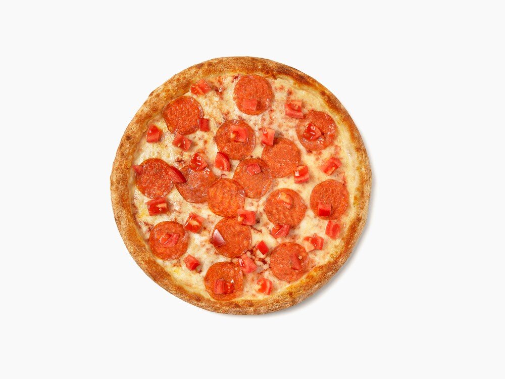 Воздушное или тонкое тесто на выбор, соус на основе томатов и прованских трав, сыр моцарелла, пепперони, томаты свежие
